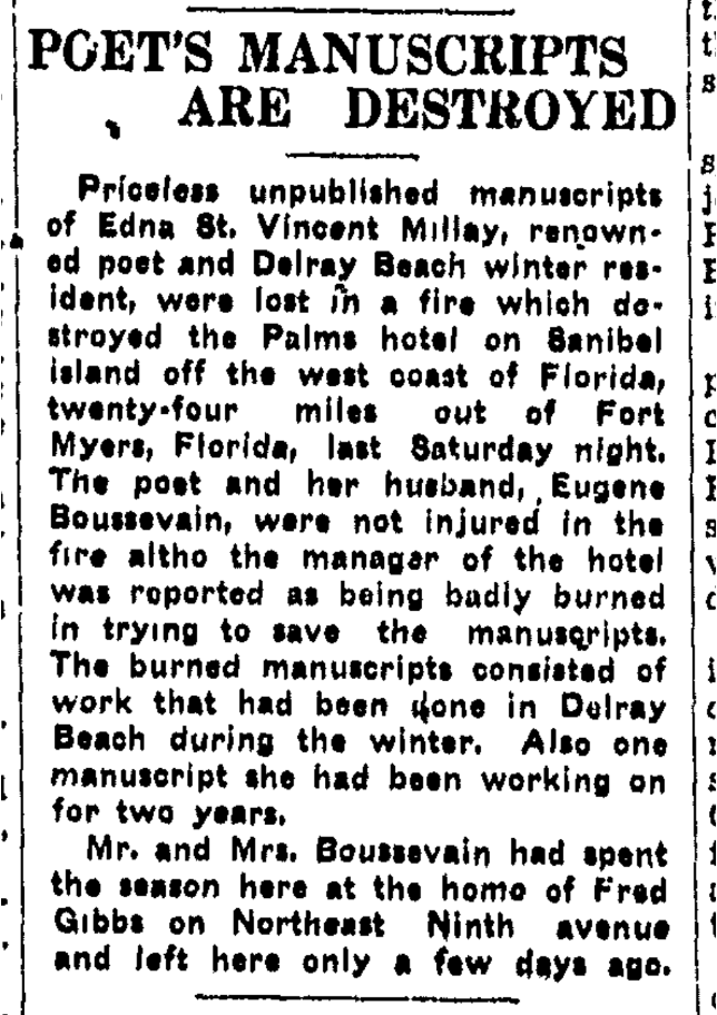 Despite the ice-cold water, Millay was able to work on her poems, which later became the collection, Conversation at Midnight. The original manuscript for that collection, however, was lost in a hotel fire while Millay and Eugen were in Sanibel. (This news clipping is the only hint we have as to where Millay lived in Delray).