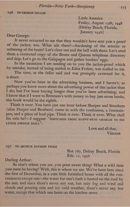Millay briefly described her experience in Delray in letters to her friends and editor that winter. For example, she did not enjoy some of the area’s fauna. To editor and poet George Dillion, she wrote, “It is obvious that Harper & Bros. are trying to kill us, so that they’ll never have to have anything to do with either of us again… Only sent me one set of proofs, too… and no return envelope either, such as they always send me – and how the hell am I going to get hold of an envelope, out here among the rattlesnakes and the red-bugs?”