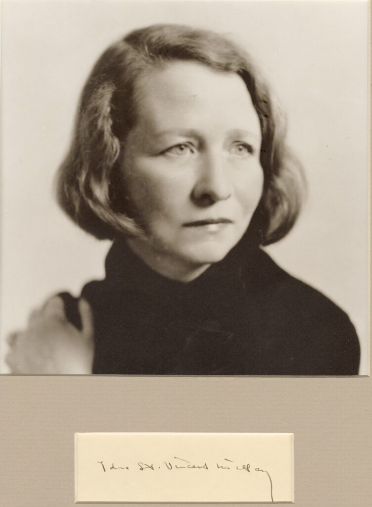 In 1911, when she was 19, Millay submitted her poem “Renascence” in a poetry contest. While the poem did not win, in 1912, it appeared in The Lyrical Year, a poetry magazine, under the name E. Vincent Millay. People immediately took notice and were shocked to find out she was a young woman. In a note to the editor, poet Arthur Ficke (who became Millay’s lifelong friend), wrote, “No sweet young thing of twenty ever ended a poem where this one ends: it takes a brawny male of forty-five to do that.” Millay responded, “I simply will not be a ‘brawny male’ . . . I cling to my femininity!” According to the Edna St. Vincent Millay Society, Millay later represented the “rebellious spirit” of the post-World War I generation, also known as the Lost Generation, and became their spokesperson for women’s rights and social equality. In 1923, she won the Pulitzer Prize for Poetry for her collection, Ballad of the Harp-Weaver. She was the second person to win that specific prize.